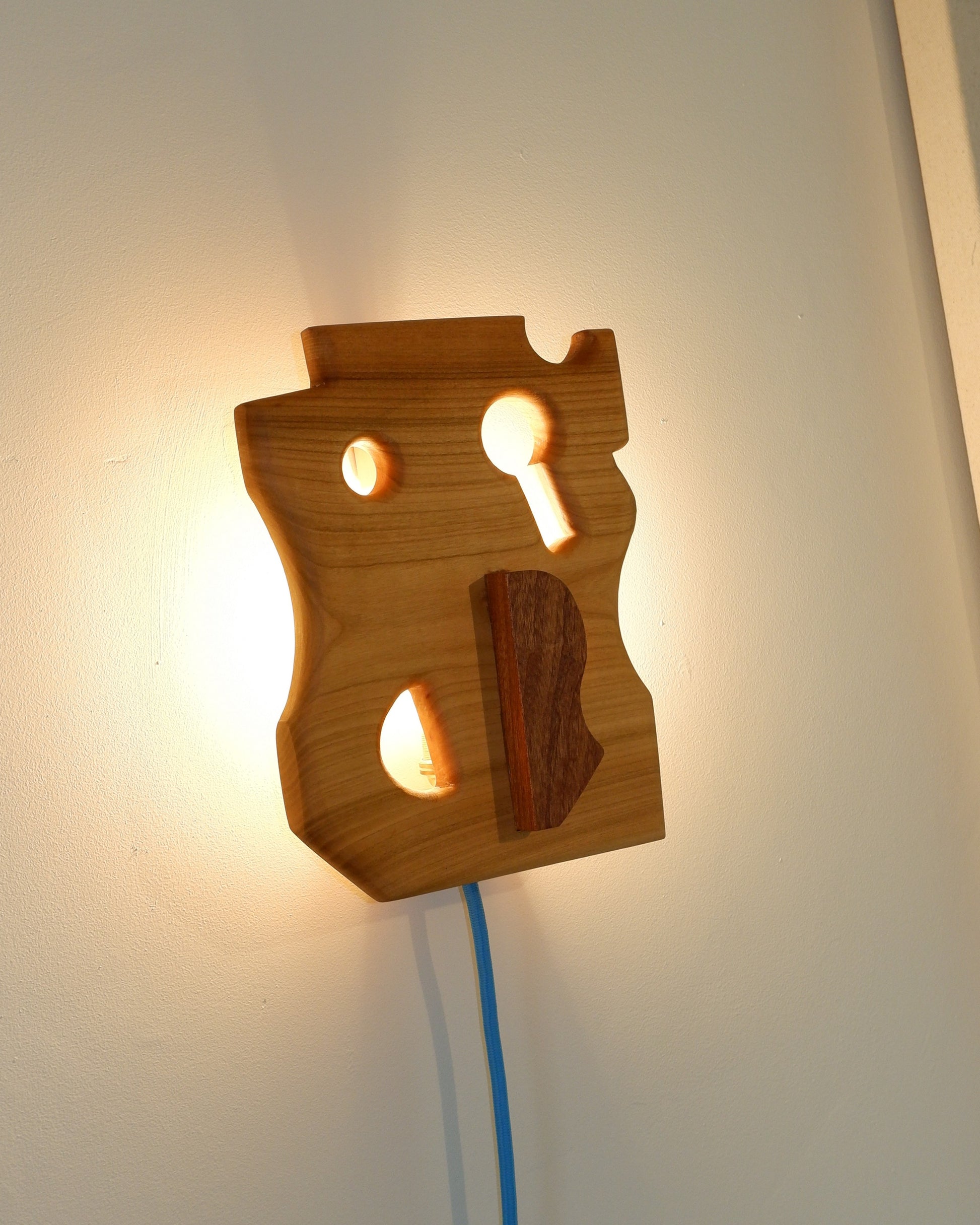 Constructed from off cuts of Cherry and Sapele, featuring B22 Brass Lamp holder, Neon Blue braided cord and clear UK plug.